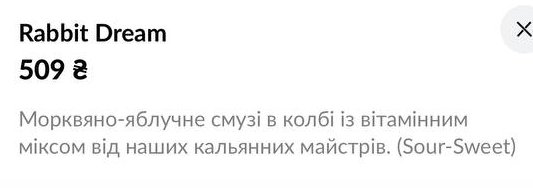 - меню также содержит кальян-меню, сигарное меню, винная карта, бургеры / сэндвичи